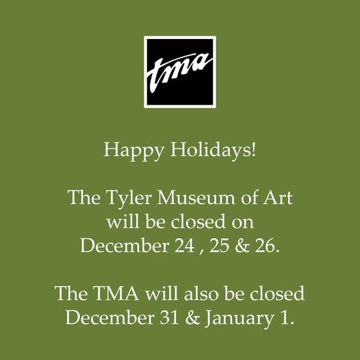 Holiday Closure Dates Happy Holidays from the Tyler Museum of Art! We will be closed December 24, 25, and 26 as well as December 31 and January 1. The TMA Cafe will be closed until Tuesday, January 6. Previous postNext post -->